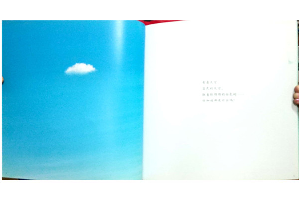 《云》这本书呈现给孩子不同的云的形态,让孩子们对云有大概的认知。然后和孩子一起想象自己是天空中的一片云,带着“我是云”的心情一起读一遍,试着感受云的神奇之处。