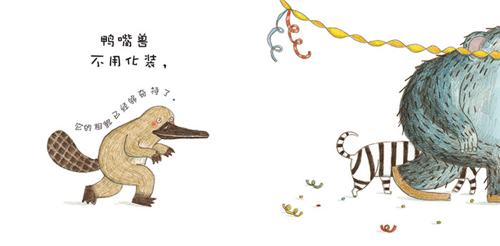 书中信息含量大,通过各种动物化装成与自己从体型、样貌、生存习性都具有极大差异性的另外一种动物,制造出喜剧效果,通过陌生化来不断创造阅读的兴奋点,悬念迭起,不断推动读者从一个惊喜过渡到另一个惊喜,从视觉跳跃到思维跳跃。是对孩子想象力和发散性思维能力的大挑战。
