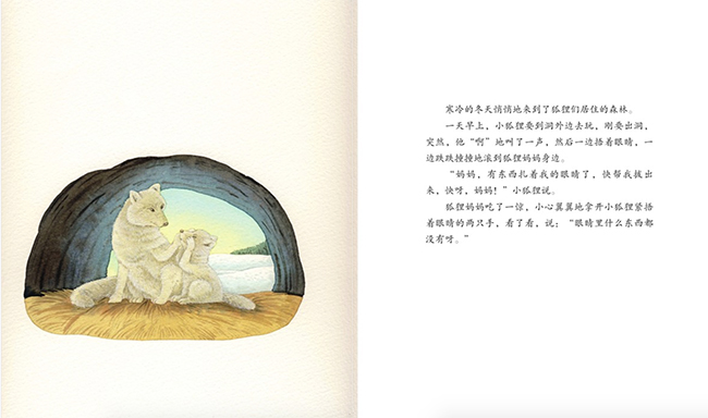 狐狸的身后传来一阵“吧嗒,吧嗒,咂——”的声音,接着粉状的雪花就向小狐狸身上盖下来。 小狐狸大吃一惊,跌跌撞撞地向前猛冲了好远。 “这是什么呀?”小狐狸心里想着,又回头看了看。原来那是枞树枝上的雪积压得太多,从树枝上掉下来发出的响声。 不一会儿,小狐狸回到洞里。 “妈妈,手好冷啊,都冻僵了。”小狐狸一边说,一边伸出两只湿乎乎的,冻得有些发紫的手给妈妈看。