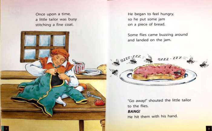 一个小裁缝毛巾一拍就打死了面包上的七只苍蝇,从而很佩服自己,于是系上一条写着“一下子打死七个”的腰带去闯荡世界。他凭着自己的勇敢与机智,发挥自己的优点,隐盖自己的缺点,打败了强大的巨人,凶猛的独角兽和九五至尊的国王,还娶得了美丽的公主,最后还当上了国王的故事。