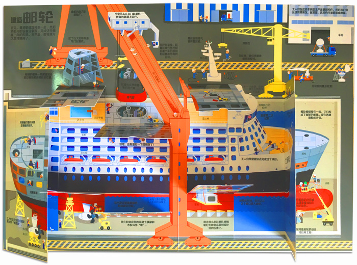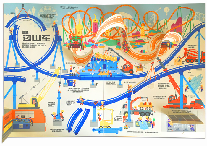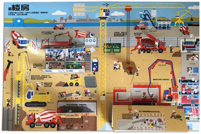 对于年龄稍大、有一定社会知识积累的孩子,这更是一本理想的亲子阅读读物。家长可以帮助孩子朗读书中的名词和注释,由于本书专业性强,文字较为简约,对孩子感兴趣的部分,还需要家长做进一步的解释。此外,由于每个主题是现实场景的直观展示,并非按普通阅读顺序设计,所以家长不妨提前浏览做好功课,按照每一个大工地特定空间布局和施工步骤引导孩子阅读。当然,孩子有自己的认知方式,他们往往不在意逻辑关系,而是随心所欲地去发现和学习。我们尽管尊重他们的习惯方式,只是在他们需要帮助的时候,给予恰当的解释和帮助,真正让他们享受玩具书的乐趣。