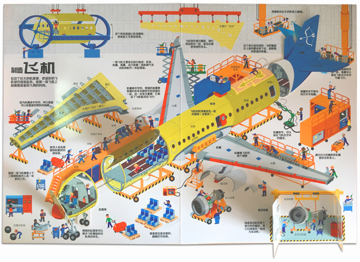 翻开它,每一页都是一个跨页设计的逼真场景,让宝宝身临其境一般身处大工地,看楼房如何平地而起、地铁隧道如何开掘通车、公路怎样层层铺就,甚至游乐场的过山车、马戏团的演出大棚又是怎样安装和搭建起来。不仅如此,宝宝还可以随吊车司机升到高高的塔顶,跟建筑工人下到深深的隧道,可以“掀开”各种大型机械和设备的外壳,甚至进入飞机机翼和轮船的内部去发现建造的秘密 。如此直观而又动态向孩子展示施工场景和大型机械的内部构造和工作方式,真是新鲜!这正是别具匠心的玩具书带给宝宝的别样乐趣。