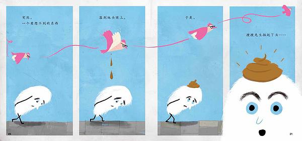 这一幅看似寻常的社区生活图景,却暗含着幸福的真谛:创造美,分享快乐,关注身边的人,和他们一起享受时光。我们看到最后悠然荡着秋千的搜搜先生,他依然保留着头顶的小鸟便便,这大约是因为,小鸟对他的“袭击”无疑是一次塞翁失马的经历,搜搜先生用它提醒着自己在搜寻伟大的目标和成就之外,将目光投注于生活中微小而动人的细节处。