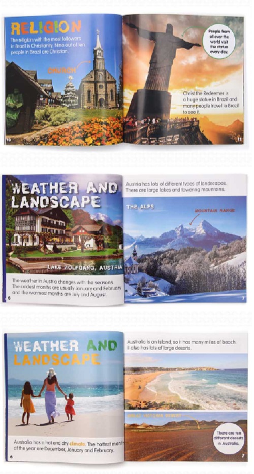 书中简明扼要的介绍了此国地理位置,标志建筑,首都,人口概况,气候地貌,孩子还会了解到此国家人民的着装习惯,种类不同的宗教,美食,校园和家庭生活。