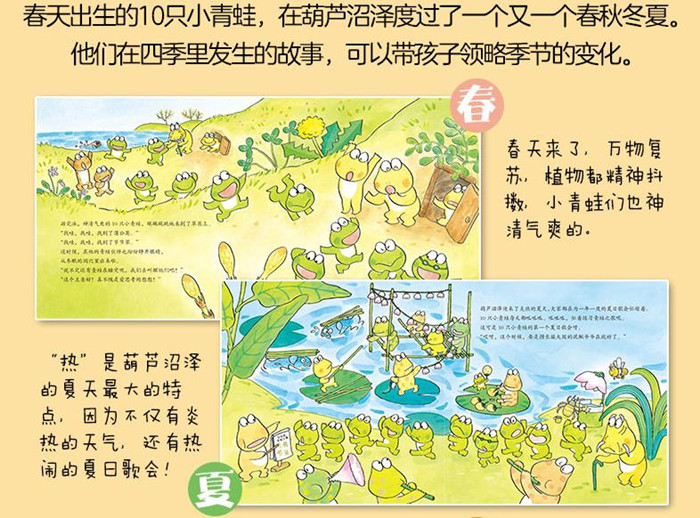 “10只小青蛙系列”是一套反映孩子在集体生活中自由成长的图画故事书。套书共18册,讲述了10只小青蛙团结协作,一起战胜生活中各种困难,一起快乐健康成长的故事。他们一起战胜凶猛的小龙虾,躲避危险的漩涡和龙卷风,也一起参加春游、露营、运动会;他们一起经历春夏秋冬、四季变化,也一起过七夕、中秋、新年;他们一起认识美丽的荷花、能止血的艾草,也一起了解蝙蝠、蛇、小龙虾、泥鳅等动物的习性……不管什么时候,他们都始终为了同伴、为了未来,勇敢前行、快乐成长。10只小青蛙就和幼儿园的小朋友一样,天真烂漫、机智勇敢、团结热情,什么都不怕,对这个世界充满了新鲜感。