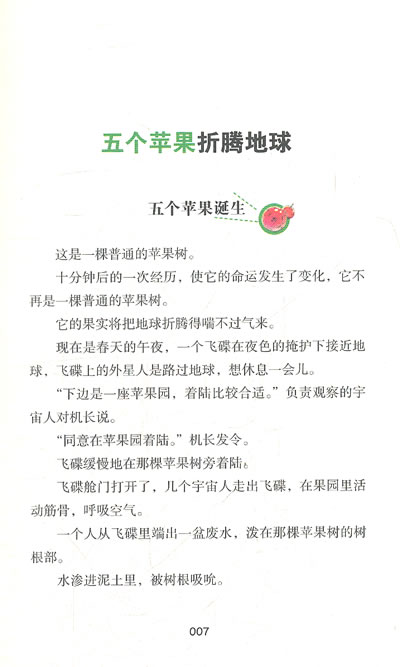 一棵被外星球的水浇灌过的苹果树结出了五个超能苹果,有四个苹果被吃掉,超人和超狗出现了,地球饱受考验。还有最后一个超能苹果。它在哪儿,一直是一个谜。没准儿,它正在哪个水果摊、超市,或者任何一个可能的地方等着你……《五个苹果折腾地球》是“郑渊洁七彩童话”系列之一。 《五个苹果折腾地球》收录了《五个苹果折腾地球》;《红鼻子火车》等故事。