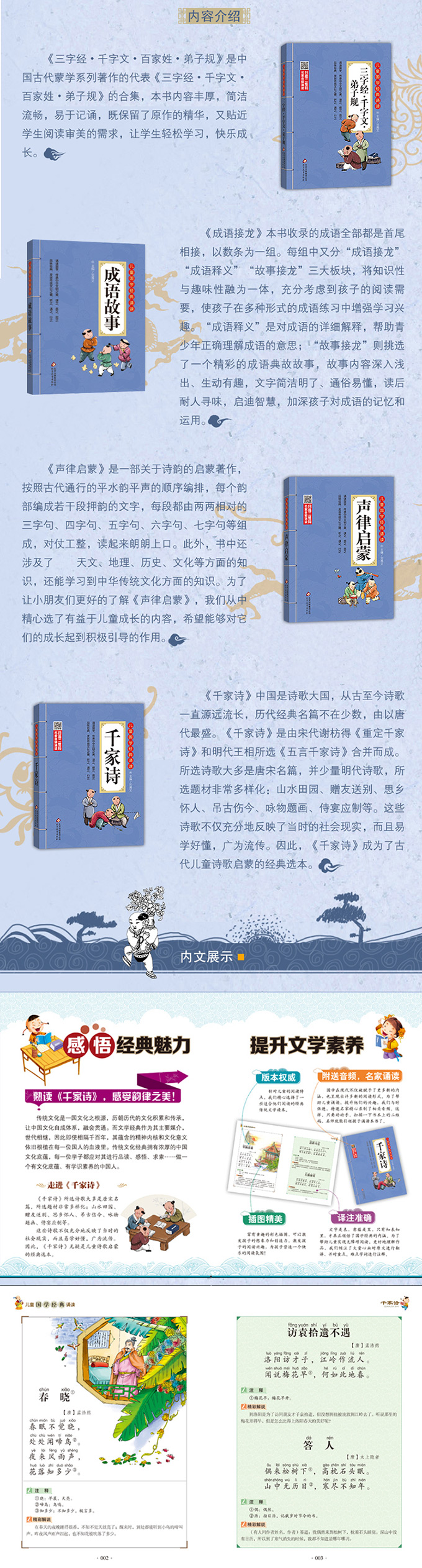 《千家诗》与《三字经》《百家姓》《千字文》并称为“三百千千”,同是蒙学中流传最广的读本。在中国传统的儿童早期教育中,儿童经过了《三字经》《百家姓》《千字文》等识字教育过程后,便要开始学习些简单的名家诗篇了,因此,多种多样的以广大少年儿童为对象的诗歌选本便应运而生。而其中最有影响、流传最广、成就最大的就是《千家诗》。全书各诗均有精练的注释、独到的赏析和作者简介,便于阅读、理解和记诵。它对于少年儿童学习、背诵古代诗歌,了解古代诗歌的艺术创造,提高传统文化的修养必有很大帮助。