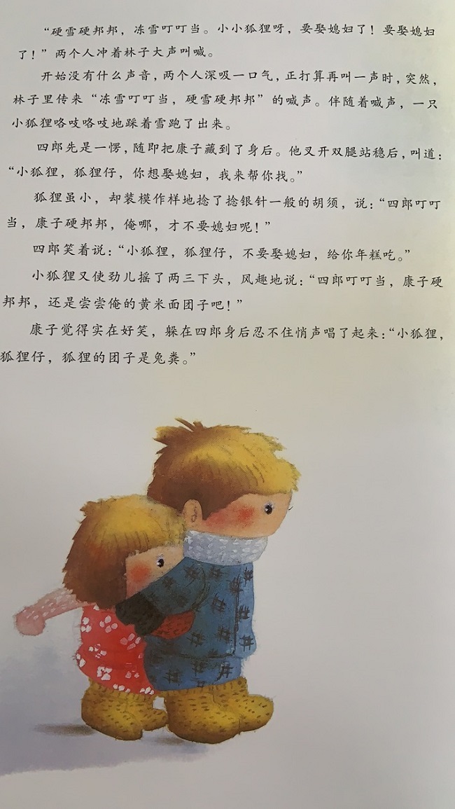 本书为儿童绘本故事(无电子书目)。宫泽贤治小时候很喜欢到附近的山上、原野里或是树林里玩。他很着迷采集植物,尤其还热衷于采集矿石,经常捡回来各种各样的石头。不过,一个人在自然中到处奔走的宫泽贤治拿回家来的,不只是这些标本。他曾说:“我讲述的这些故事,都是树林、原野、铁道线、彩虹和月光赋予我的。”也就是说,宫泽贤治的童话,可以说是他在树林、原野以及铁道线附近奔走时,与火山弹和玛瑙等一起捡回来的另一种精美的“标本”。还有,宫泽贤治在树林中和原野上行走的时候,传入他耳朵里的也不只是小鸟的叫声、风声和芒草发出的沙沙声。在《渡过雪原》中,四郎和康子受狐狸的邀请,参加狐狸在冬日满月夜里举行的幻灯会。雪冻得比大理石还要坚硬,不论是平时不能去的玉米地还是哪里,想去哪里玩就去哪里玩。在这样的日子里,宫泽贤治的想象力,在岩手地区旧时童谣的激发和鼓动下,将四郎和康子两兄妹引向狐狸栖居的森林……