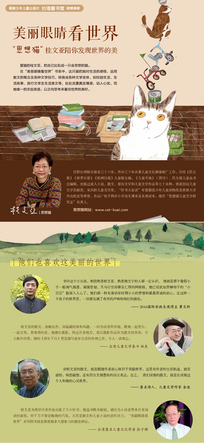 著名儿童文学作家桂文亚的经典儿童摄影散文集,跟着她用美丽的眼睛看世界,用真挚的情感体会疾苦欢欣。这一场文化之旅、心灵之旅,不只能遇见了别样的景,也会在不经意间遇见曾经的自己。思想猫桂文亚用散文之笔、镜头之眼,用饱满的情感、精妙的文字,写下你的、我的,也是他的美好故事,带给读者艺术与纪实、情趣与理趣的阅读享受。