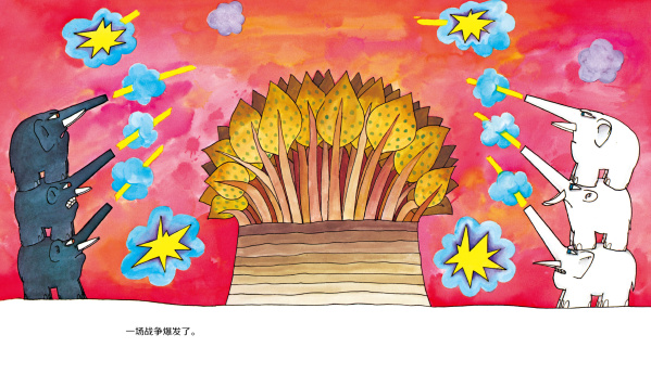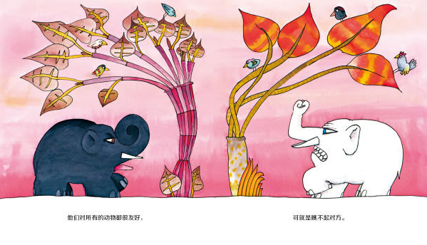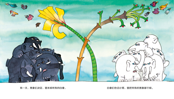 很早以前,大象有两种颜色,一种是黑色的,一种是白色的。他们分别住在树丛的两边,谁也不理谁。他们喜爱周围的一切生物,但是讨厌彼此。直到有一天,他们下定决心要消灭另一方。一些热爱和平的大象只好逃进了森林深处。黑象和白象之间,一场大战爆发了。双方一直打一直打,直到所有的象群都死了个精光。从此,人们再也没看见过大象。直到有一天,那些曾经逃进森林的热爱和平的大象们的子孙走出了丛林。令人惊喜的是,它们全部变成了灰色!灰象们有的是大耳朵,有的是小耳朵。他们和平地生活在一起。不过,最近,大耳象和小耳象又开始看对方不顺眼了。