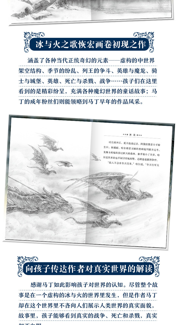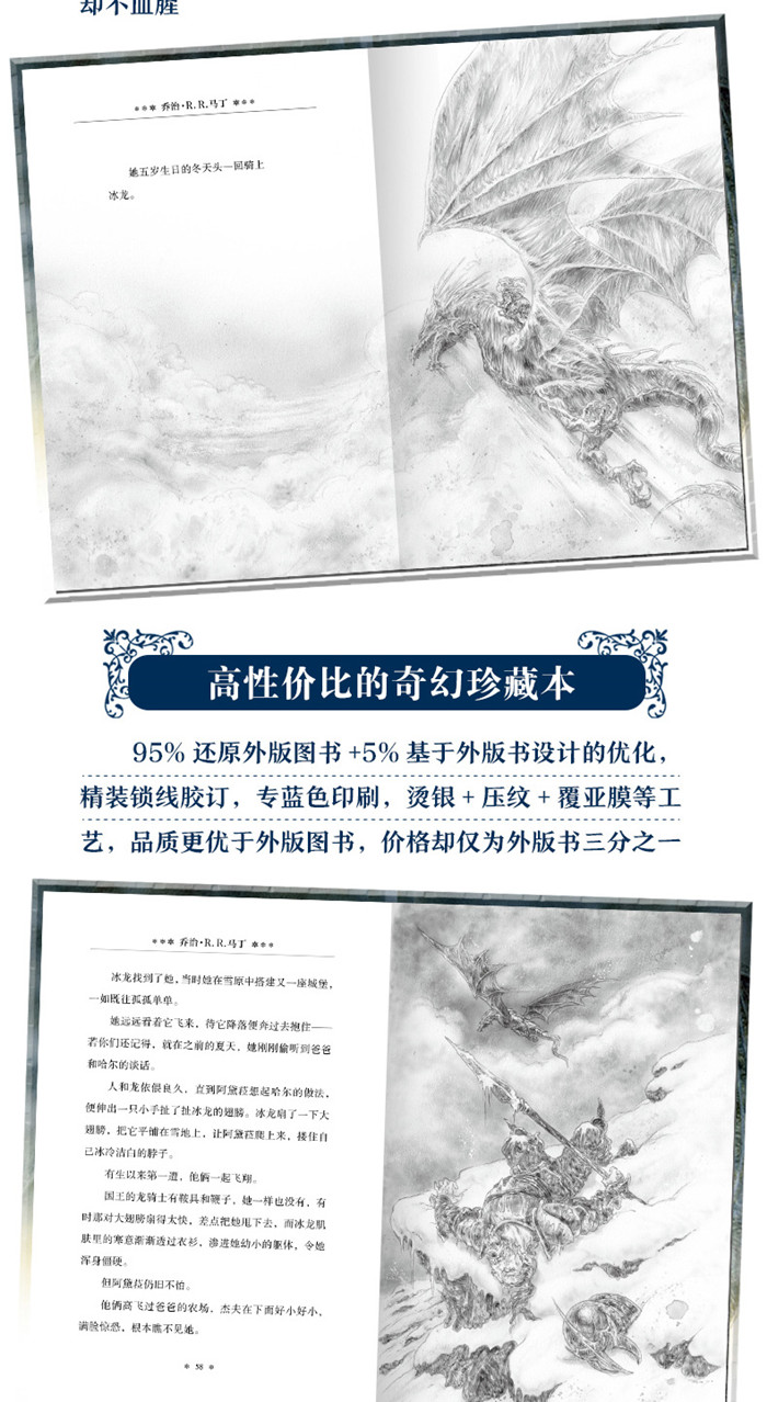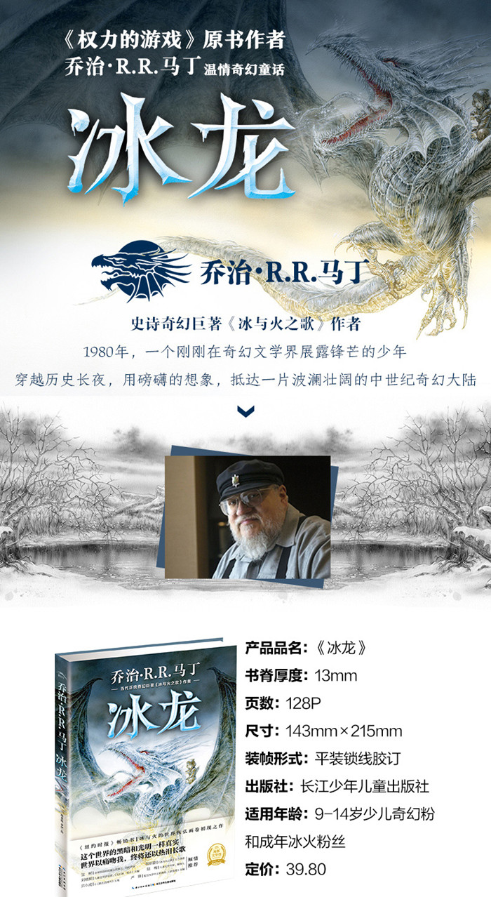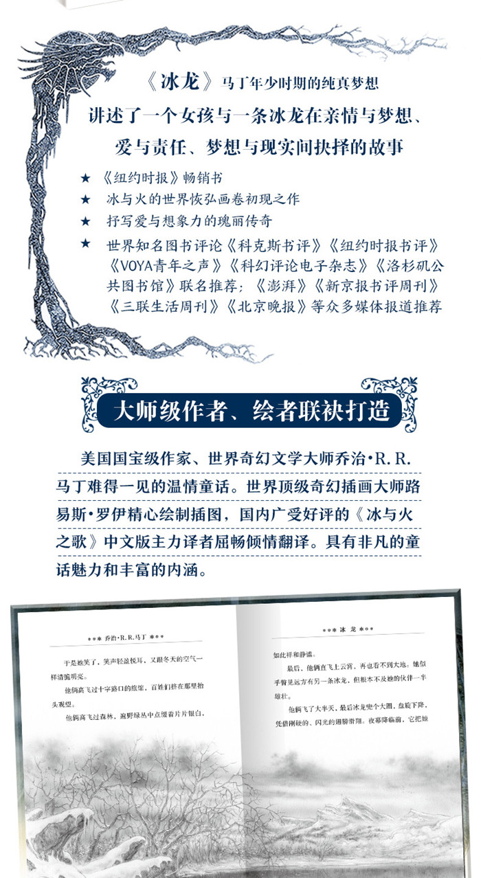 冰龙是传说中一种令人畏惧的生物,没有人驯服过它。它的出现会带来大冰冻和可怕的严寒,只有阿黛菈不害怕。阿黛菈是冬之子,降生于人们记忆中*寒冷的冬天,她跟别的孩子都不合群。 阿黛菈不记得自己遇见冰龙是什么时候。冰龙似乎一直存在于她的生命中,俯瞰着她在茫茫雪原里孤独地玩耍。阿黛菈四岁时*次触摸到冰龙,五岁时骑到了冰龙宽阔冰冷的背上。然而,在阿黛菈七岁那年的夏天,北方飞来的火龙袭击了她的家园。只有冬之子和挚爱她的冰龙能够拯救世界免遭毁灭…… 透过《冰龙》,你会看到马丁早期奇幻世界的雏形:季节的纷乱、列王的争斗、英雄与魔龙、春晓的梦想……还有家庭、爱、责任与成长的主题。极富盛名的奇幻插画大师路易斯•罗伊气势恢宏的插图,更是给这个发生在冬之子阿黛菈和她的冰龙之间的暖心故事带来震撼的烘托。