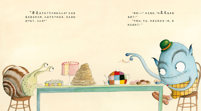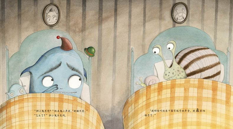 这个故事非常有趣,一点也不说教,却能让孩子在不知不觉中学会包容朋友,并明白未知事物并不可怕的道理。故事中还隐藏了一条暗线,就是胆小鬼在怕什么——从他的话中发现,他害怕的怪物就在他身边,就是机灵鬼呀!当发现这一点时,孩子和大人都会开怀一笑吧。