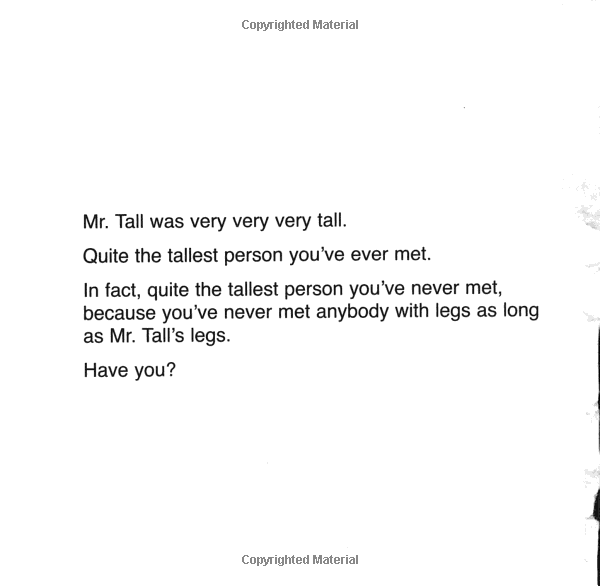 此书是著名儿童作家哈格里夫斯的作品《奇先生妙小姐》,经典的儿童图画书,可以说是经久不衰,书中每页只有短短几句话,插画则十分逗趣,每个动画人物都是圆圆的,每个动画人物都有自己的性格,很受小读者的喜爱。