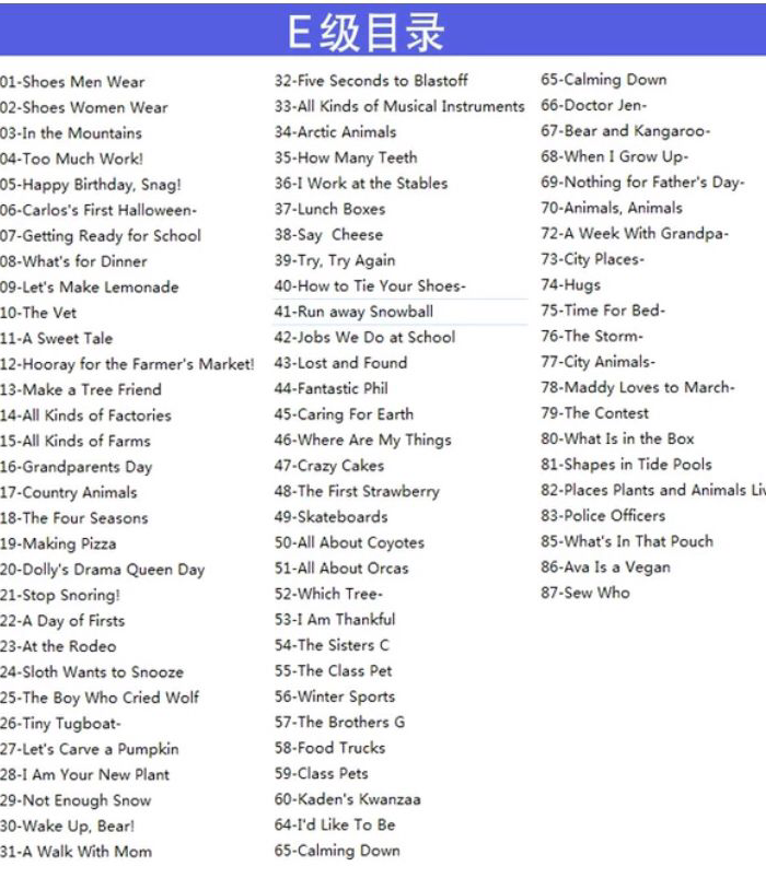 2、各大体系的英文分级读物各有各的优势,建议相互穿插,可以根据每个孩子不同的口味进行选择和调整,通过大量的阅读来建立孩子阅读的能力和知识扩充。家长千万不要为了“完成级别”而强行逼迫孩子读不喜欢的主题,尤其是学龄前,英语学习还是以兴趣为主。