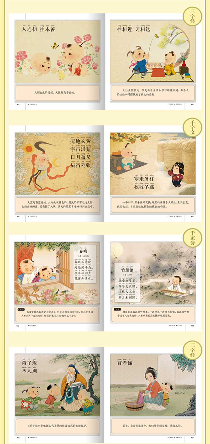 这是一套专为学龄前儿童和低年级的小学生打造的中国古典文学绘本,共17册本套书精选经典的情节,采取连环画的形式重新演绎,以期通过这种图文呼应的阅读方式减轻孩子的阅读压力,帮助孩子们更直观地理解原著。《弟子规绘本》本书在对弟子规的原文加注拼音并进行分节解读的同时,还配有精美的插画,力图用彩图直观地表现原文,很适合儿童阅读。