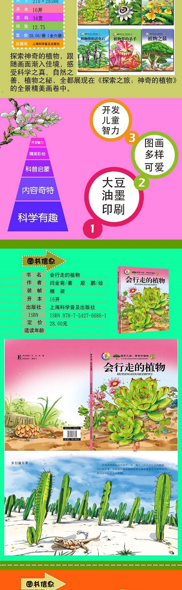 神奇的植物王国,鲜花争奇斗艳,古树参天蔽日,充满了勃勃生机和迷人的魅力,*充满了诱人的神奇和闪光的智慧……在植物王国中,植物虽然没有腿,可是为了生存,它们也会行走。由闫金菊所*、殷鹏编绘的这个绘本《会行走的植物(精)/探索之旅》用童真的语言一一为你讲述了这些会行走的植物,用*精美的图画,加以准确、科学的图解文字,生动形象地向孩子们展示了这些会行走的植物界中神秘、有趣、耐人寻味的行走形态,让孩子们在充满趣味的阅读中,轻松愉快地开拓视野、增长知识。