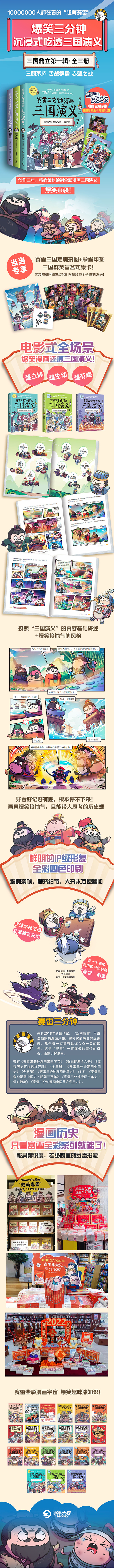 1000万人正在看的“超萌赛雷”,前后创作三年,精心绘制全彩漫画三国演义! 电影式全场景,爆笑还原三国演义!超立体,超生动,超涨知识! 三国群英盲盒式集卡!随书附赠赛雷三国群英卡! 套装共三包群英卡! 《三国演义》可以说是古代中国重要的长篇章回体历史小说。“三国演义”有多个版本,但一直缺少一套立体生动的漫画版本。而作为以立体生动为擅长的赛雷,正是要创作这样一套立体生动全场景呈现三国历史的作品。三国鼎立辑全三册展现三顾茅庐、单骑救主、舌战群儒、赤壁之战等经典场景,生动地再现三国场景,让读者在哈哈大笑中了解三国的历史。 它突出的地方就在于用赛雷漫画的幽默风格按时间线索将三国的历史讲述出来,让读者在哈哈大笑中知晓三国历史的发展脉络。