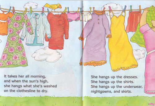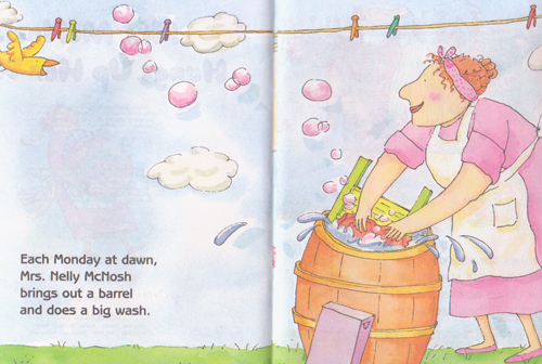 Each Monday morning Mrs. McMosh hangs up her wash, the mail, a dog with his bone, a kite...What will she hang up next?