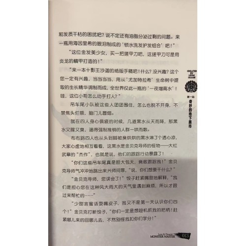 “怪物大师”是为9-14岁少儿量身定制的奇幻冒险成长小说。讲述了在一颗神秘的魔法世界里,一根筋的布布路,神秘莫测的饺子,坏脾气又毒舌的帝奇,霸气十足的大姐头赛琳娜,四个个性十足的角色,为了共同的梦想——成为怪物大师,和自己的宠物精灵踏上冒险之旅,在一个神奇的奇幻世界里,完成一次次梦想的试炼。