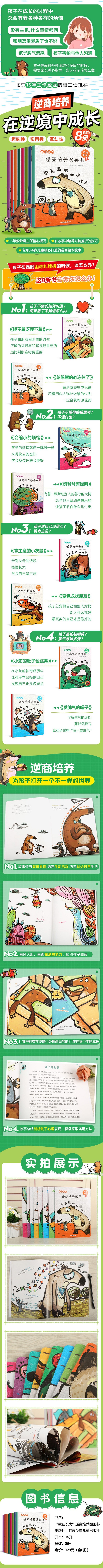 《“我在长大”逆商培养图画书》系列以森林里各具特色的小动物为主角,描绘了他们各自的烦恼和困惑,并且在寻找解决方法的过程中不断成长的故事,带给孩子正面的情感与行为引导,让孩子学会在逆境中解决问题,在逆境中不断成长,成为更优秀的自己。 全书分成8册,内容如下: 《变色龙找朋友》让孩子做真实的自己,而不是一味模仿别人; 《小蛇的肚子会跳舞》让孩子学会接纳自己,不再害怕自己的特别与另类; 《睡不着呀睡不着》让孩子学会沟通,学会表达真实的内心想法; 《拿主意的小灰鼠》让孩子更有主见,学会自己拿主意; 《憨憨熊的心冻住了》让孩子学会道歉,知道犯错了不应该逃避而应该积极弥补; 《树爷爷剪绿荫》让孩子学会付出,懂得付出很多时候就是一种收获; 《会缩小的烦恼》让孩子学会理解,懂得换位思考,烦恼就会越来越小; 《发脾气的帽子》让孩子懂得控制负面情绪,成为自己情绪的主人。...
