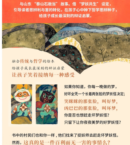《好梦妖怪与坏梦妖怪》是BIB 金苹果奖、法兰克福全球插画奖全场大奖得主乌猫与新锐作家韩洁强强联手的最新原创绘本,讲述双面梦妖为村庄带来美梦与噩梦,村民请捉妖师封印了“坏梦妖怪”,却因日日沉溺于“好梦”导致生活荒废,最终捉妖师恢复梦之循环的故事。本书插画汲取民间色彩语汇,以水墨没骨技法晕染,赋予妖怪憨萌灵魂;文字融合唐代《广异记?天宝彍骑》“坏梦妖” 传说与山东 “泰山石敢当” 故事。作品借 “梦妖共生” 的设定,引导读者思辨利与害的转化。设计配套 “好梦坏梦情绪卡”,积极助力儿童心理健康,全书兼具阅读趣味与收藏价值。