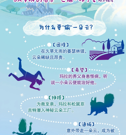 讲述了一个神秘人物——“偷云朵的人”——能够从云朵中钓下如雨滴般的鱼,为岛屿居民带来丰盛的收获。这个故事充满了奇幻色彩,旨在激发孩子们的阅读兴趣和创造力。